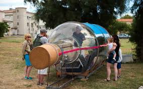 Warga ketika mengunjungi Abraham Poincheval yang berada di dalam rumah botol raksasa di Port-Saint-Louis-du-Rhone, Perancis (31/7). Abraham membuat rumah botol sebagai bentuk dari partisipasi dalam festival seni tahunan Les Envies Rhonements yang digelar hingga 2 Ogos 2015.