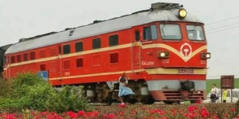 Nah, gadis ini tampaknya berfoto terlalu dekat dengan rel keretapi. Meski sudah diingatkan oleh warga setempat, gadis itu berkeras untuk berdiri di lokasi yang berbahaya.
