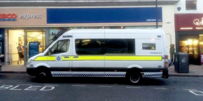 Para pengunjung restoran Taco Bell di pusat kota Nottingham, England, melihat dengan rasa tak percaya ketika sebuah kereta milik kesatuan polis anti rusuhan parkir di depan restoran itu.