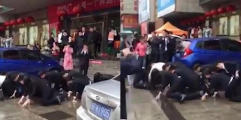 BEIJING - Sekelompok karyawan perusahaan leasing di kota Jilin, China merangkak di jalanan kota itu sebagai bentuk penyesalan kerana tak mencapai target yang diberikan.